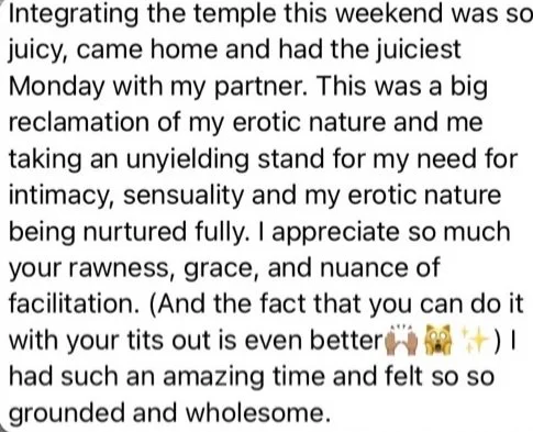 To step in, you need the tools: knowing how to navigate consent and having the embodied language that makes intimacy work. This is about you feeling resourced and grounded and preparing you to navigate the intensity that temple spaces potentially have with clarity.